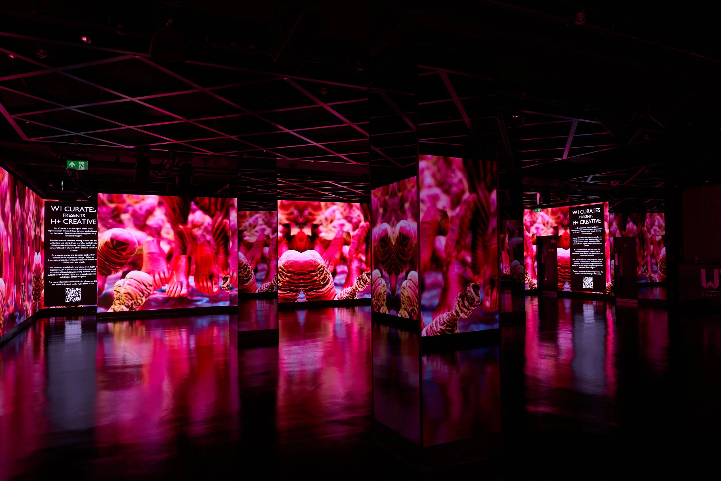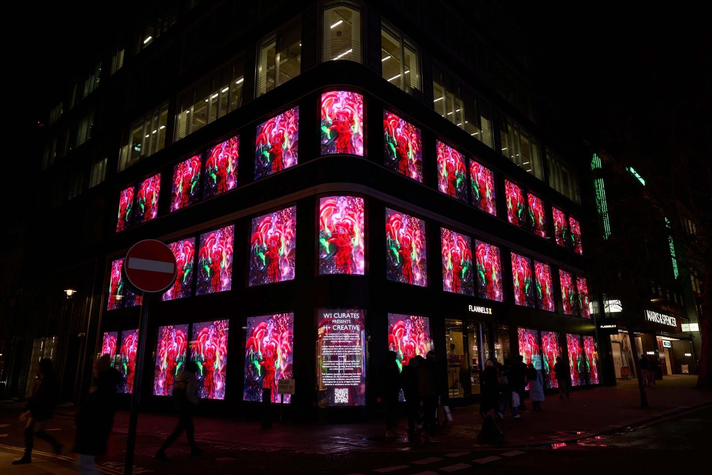 Presented as part of REVERIE, an H+ Creative exhibition celebrating ten years of international digital practice, the work occupied W1’s monumental LED façades in the heart of London’s Oxford Street.
