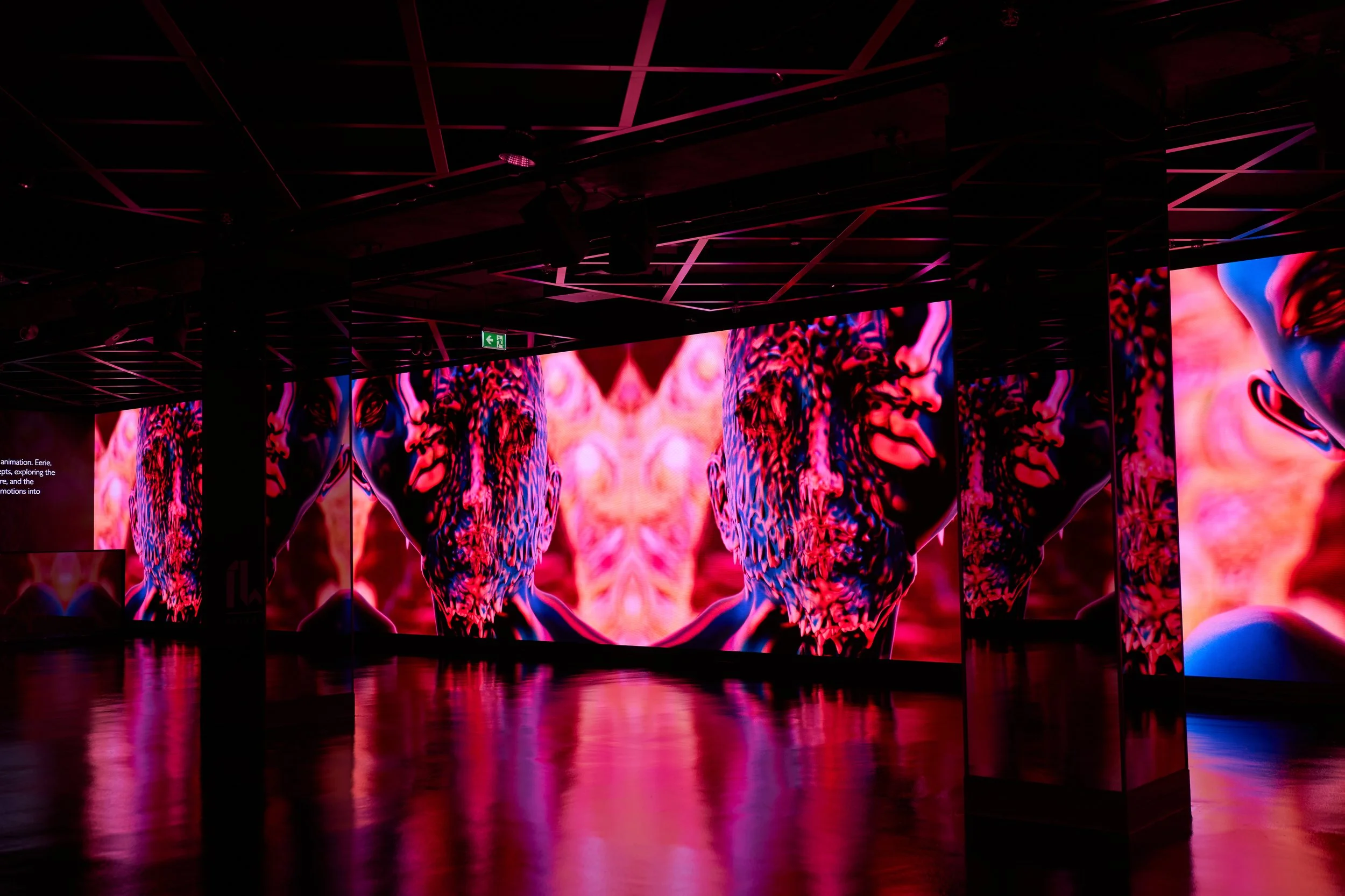 Rather than existing as a singular projection, the work became part of a curated collective statement on contemporary digital art as an evolving ecosystem. The urban façade functioned as a porous threshold between internal visual landscapes and the density of public space.