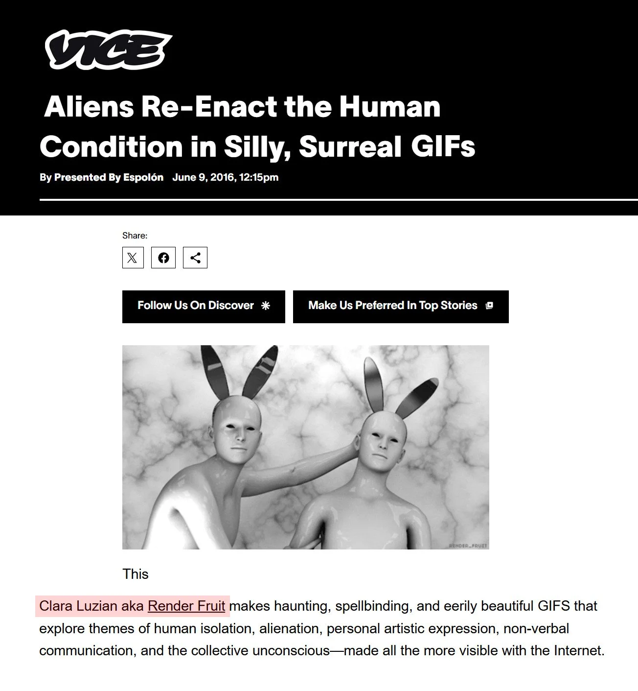 Renderfruit (Clara Luzian) is a Digital Artist and Art Director with more than 10 years of creative and commercial achievements in 3D art, motion design and creative direction.