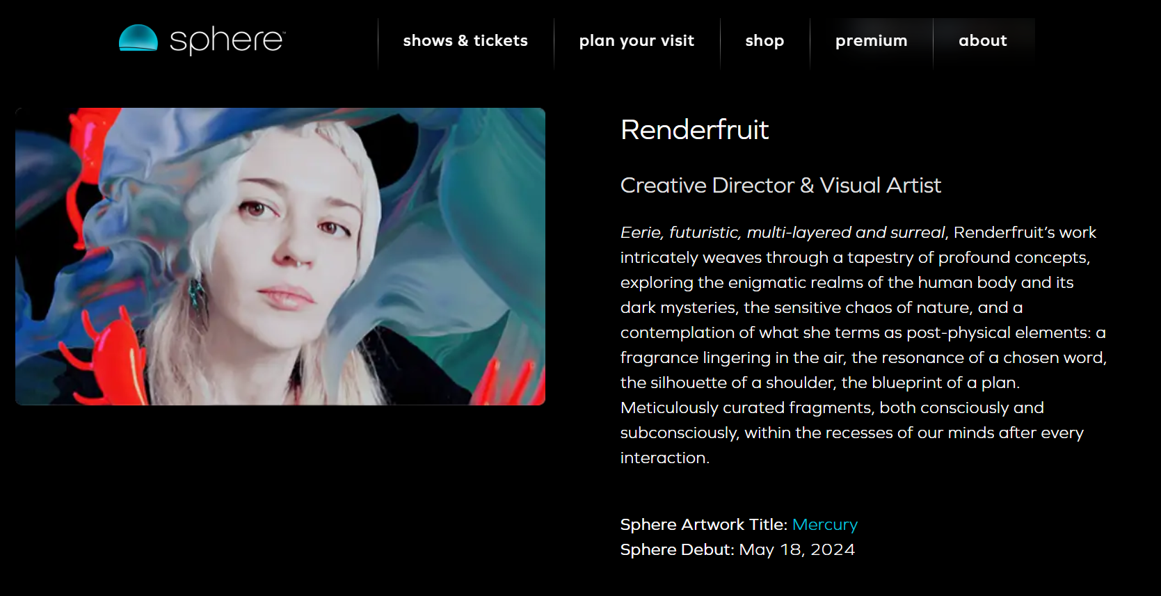 She has created content for major brands such as Apple, Nike, Paramount and Facebook, and developed large-scale stage visuals for live music performances by Young Thug, Kodak Black, Miley Cyrus, and Kehlani, leading multidisciplinary teams of sound and light designers, developers and technologists to bring each project from concept to final delivery. Renderfruit has also collaborated on music videos elite artists, including Rihanna, Kanye West and Will.I.Am.